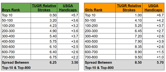As you can see, the difference in a USGA handicap between someone ranked 800th and someone ranked 100th is very small, perhaps 1.5 shots per round looking at the Boys. However, using Relative Strokes as an indicator, there’s a difference of over 3.5 shots per round.